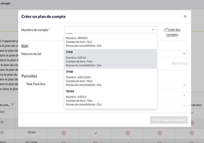 Sélectionner une ou plusieurs natures de lot dans le menu déroulant, puis cocher les cotisations correspondantes afin de les affecter à votre sélection. Cliquer sur Créer le plan de compte pour enregistrer l'affectation.
