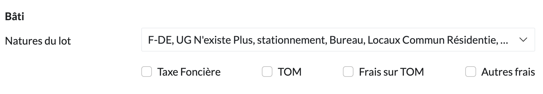 Le formulaire est composé de 2 parties, le patrimoine bâti et les parcelles (ie. patrimoine non bâti).
