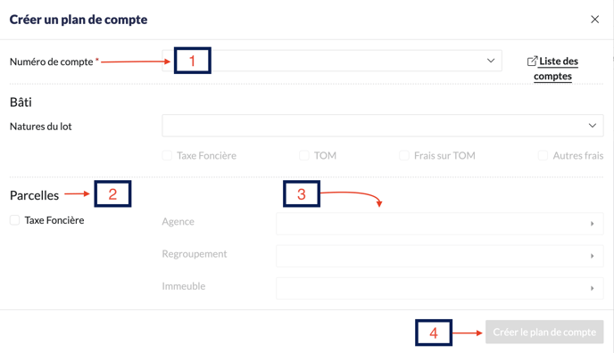 2. Sélectionnez le N° de compte, puis passez à l'étape "Parcelles", affectez la structure souhaitée et enfin cliquez sur "Créer le plan de compte".