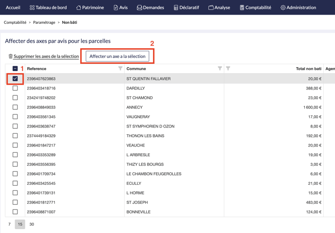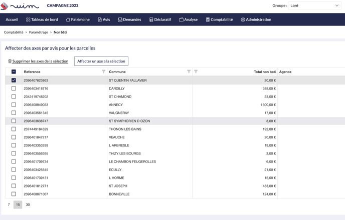 Toutes les cotisations non bâties d'un avis seront donc affectées à l'axe sélectionné.