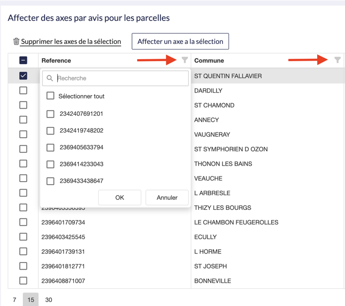 2. Sélectionnez l'avis en question, puis cliquez sur affecter un axe à la sélection.