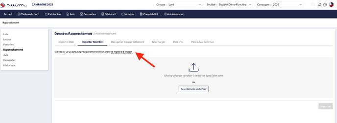 1. Suivez le chemin suivant : → Administration → Données → Rapprochement → Importer Non Bâti → le modèle d'import.