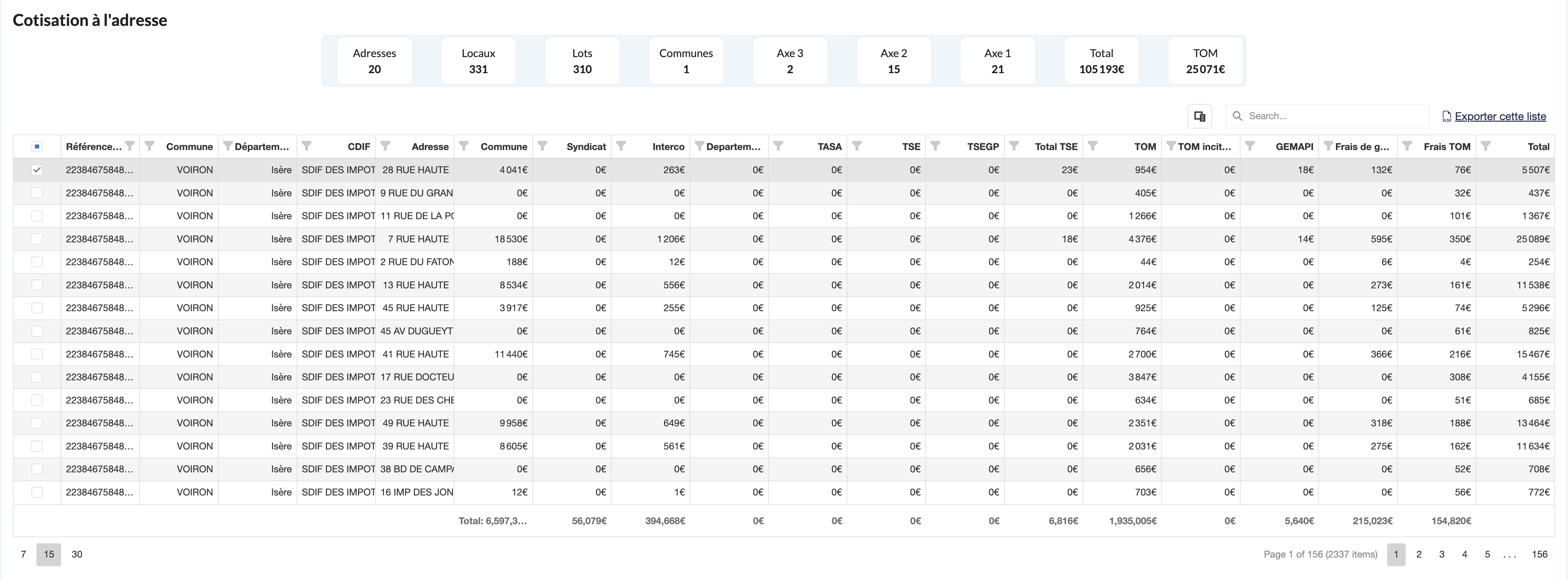 Cette édition ne sera disponible et pertinente qu'une fois les avis validés et les matrices cadastrales importées. L'objectif de cette édition est de remonter les cotisations par adresse.