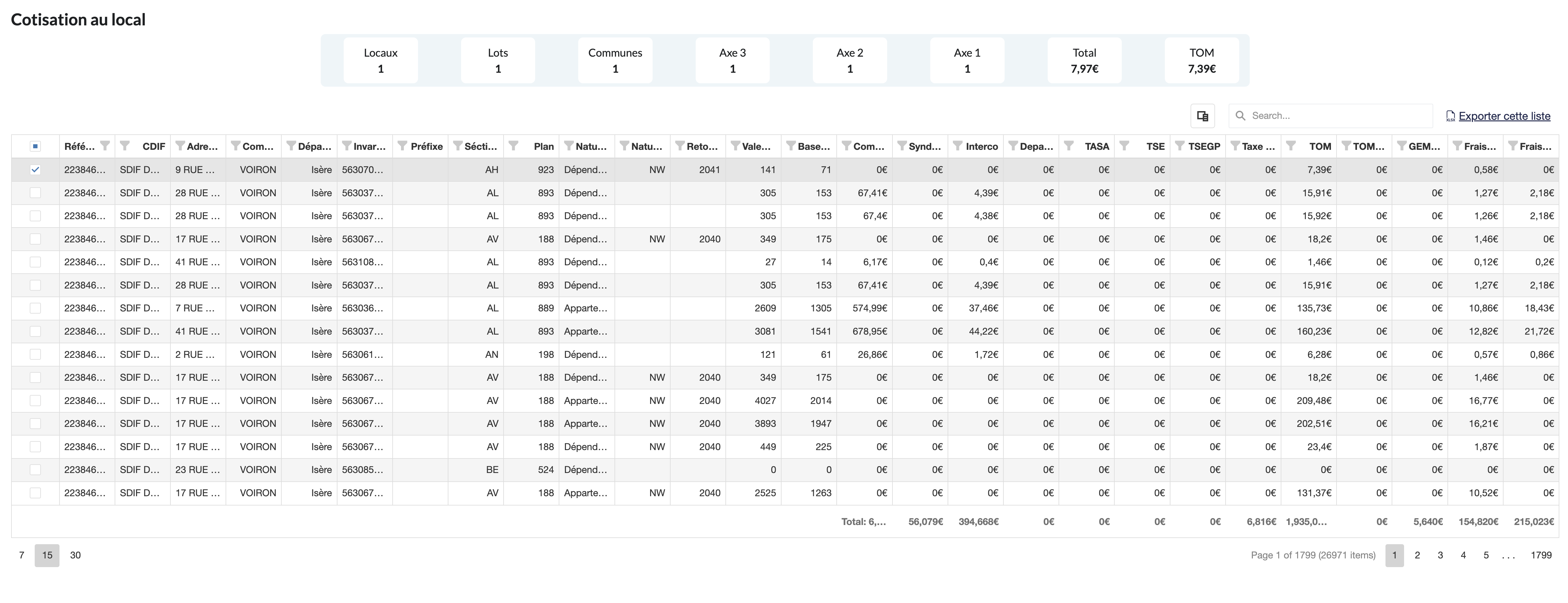 Cette édition ne sera disponible et pertinente qu'une fois les avis validés et les matrices cadastrales importées. L'objectif de cette édition est de remonter les cotisations par local.