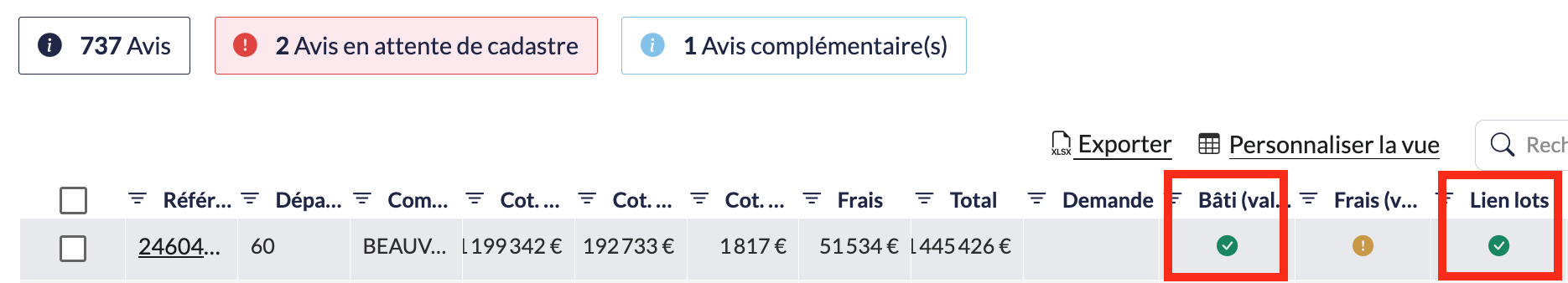 Les avis que vous pouvez comptabiliser sont identifiables grâce à deux icônes vertes validées comme celles-ci (Bâti et lien lots) :