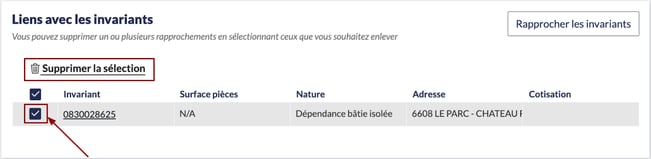 - Sur la fiche du Lot ou fiche Invariant, dans l’encadré “Liens avec les lots” ou “Liens avec les invariants” cochez le(s) rapprochement(s) à supprimer