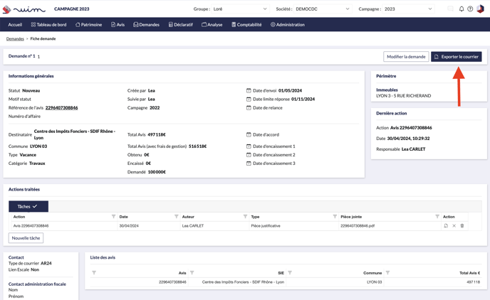 Notes : Si une demande est rattachée à plusieurs avis, WIM exporte un courrier par avis.