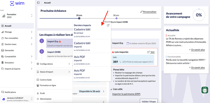 Ou encore depuis votre Nom utilisateur > Statut d'import.