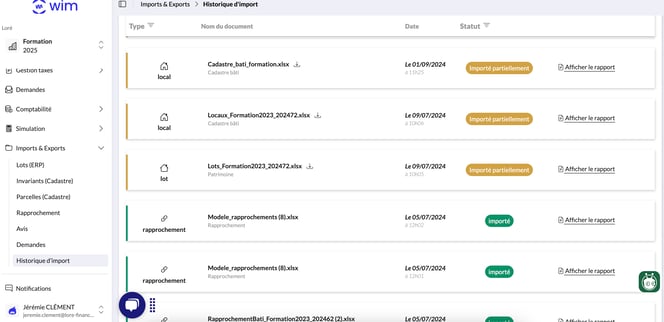 - Si votre ligne d'import est typée comme "importé partiellement", cela signifie que votre import a rencontré des difficultés. Vous pouvez cliquer sur "afficher le rapport" pour consulter la liste des anomalies.