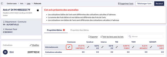 Écarts visibles entre les données affichées dans WIM (taux, montants, codes) et celles figurant sur l’avis PDF.
