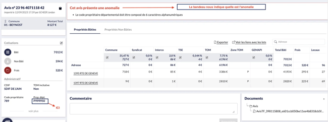 Il se peut qu'il y ait des erreurs de report des codes (par exemple WIM peut confondre un 7 avec un 1). Si le Code Propriétaire Départemental est mal reporté sur WIM, cela s'affichera de la manière suivante :