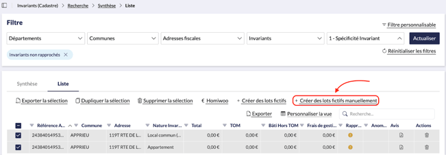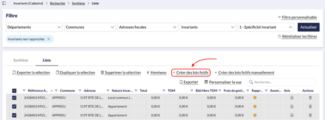 Un lot fictif sera ainsi créé pour chacun des invariants non rapprochés (sauf exception possible : invariants sans cotisation).