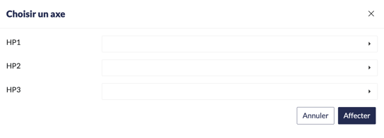 Vous pourrez y choisir vos axes analytiques pour créer vos lots fictifs. Il faudra au minimum compléter le HP1 (axe le plus large), et vous pouvez aller jusqu’à l’HP3 pour comptabiliser de manière plus fine.