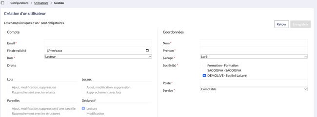 Renseignez les infos essentielles (email, rôle, sociétés, date de validité…). -