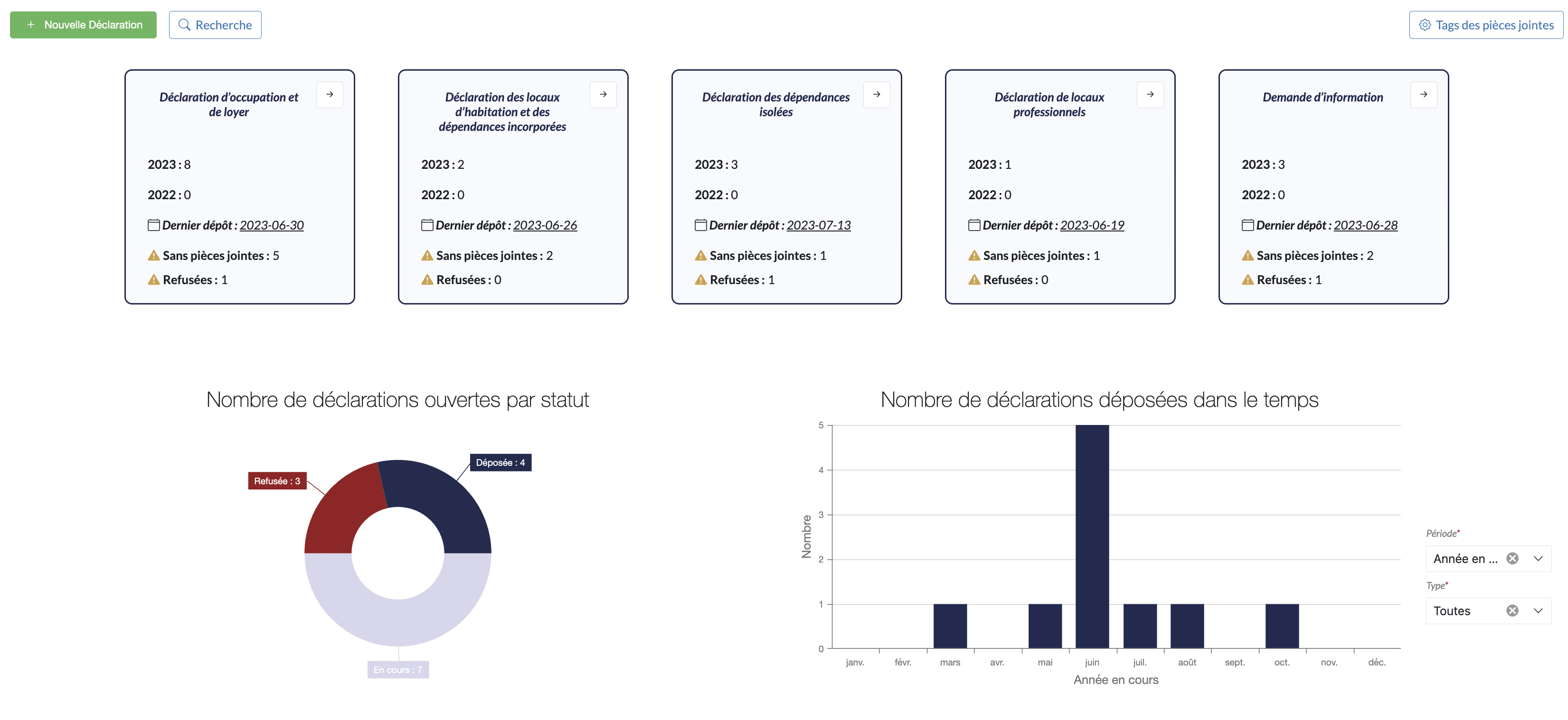 Les menus déroulants vous permettent de visualiser graphiquement le nombre de déclarations sur l'année en cours ou l'année précédente ou bien de filtrer les graphiques par type de déclaration.