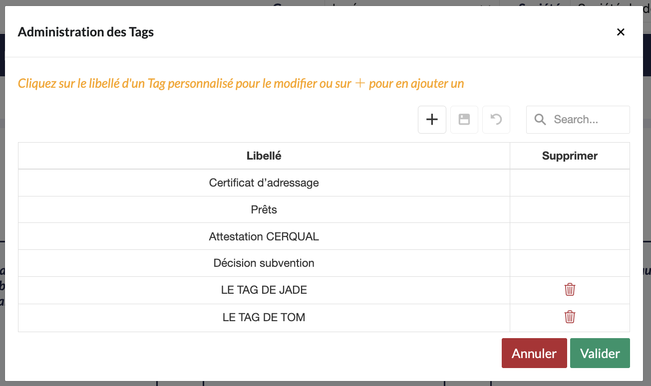 Les tags sont des mots-clés ou des libellés qui peuvent être attribués aux pièces jointes. Les tags sont utilisés pour organiser, catégoriser et faciliter la recherche de contenu spécifique.