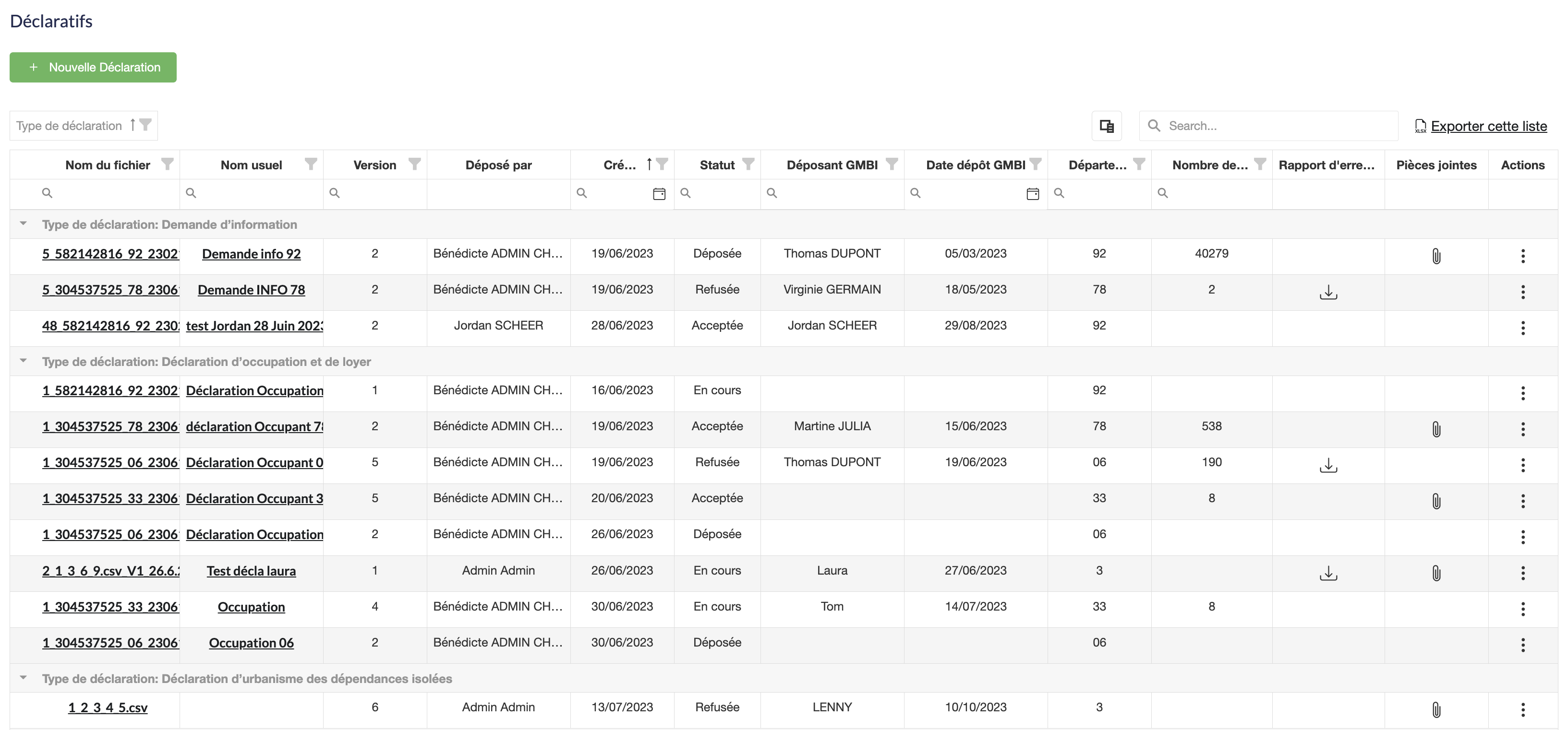 Attention : "Crée par" concernent l'utilisateur de WIM qui a stocké la déclaration. Déposant GMBI peut être différent et correspond à la personne de votre organisme qui a déposé la déclaration sur l'espace GMBI.