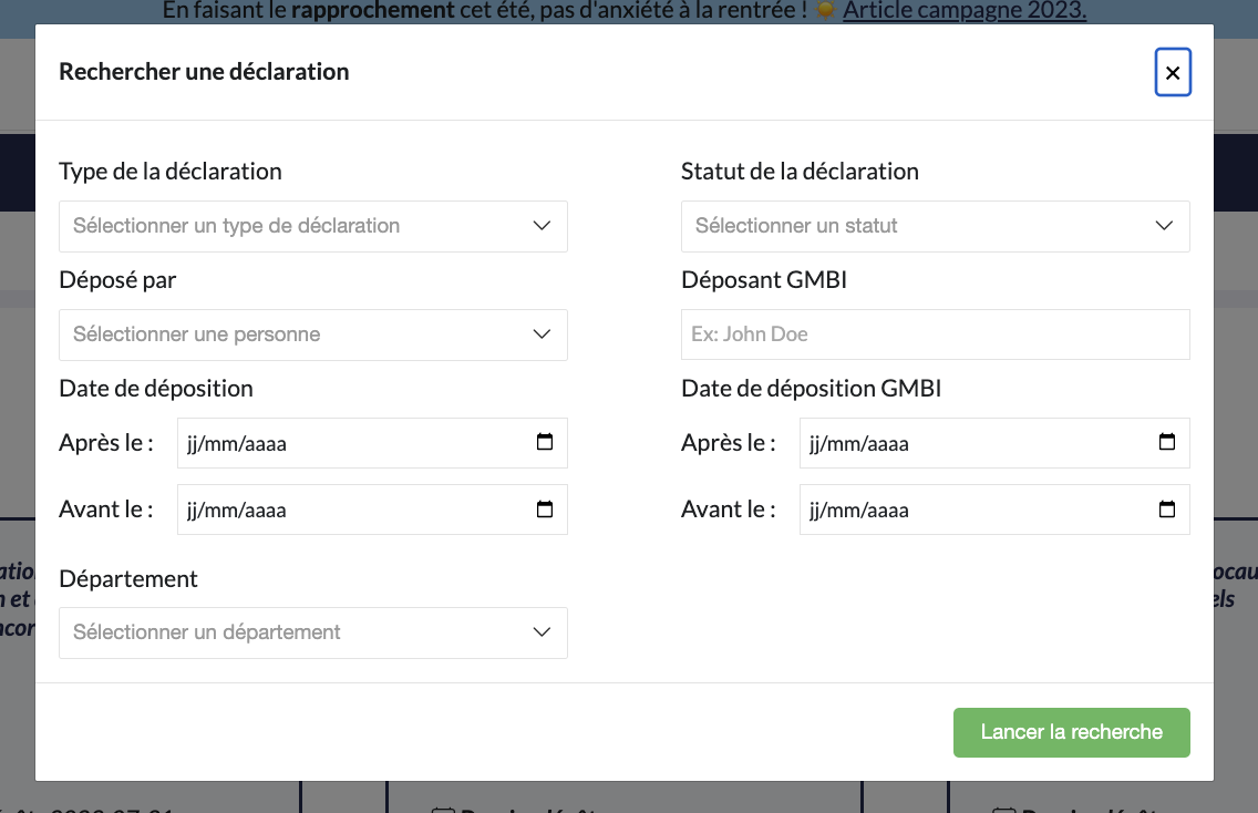 Le module de recherche vous permet de trouver les déclarations selon leurs caractéristiques, il est disponible dans la vue synthétique.