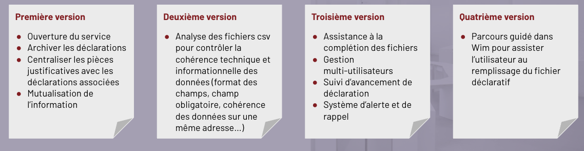 Important : Wim vous permet de stocker et créer un historique de version. Pour une même version, vous n'êtes pas limités en termes de volume. Dans les fiches des déclarations, vous pourrez consulter le nombre de versions et télécharger les fichiers déposés.
