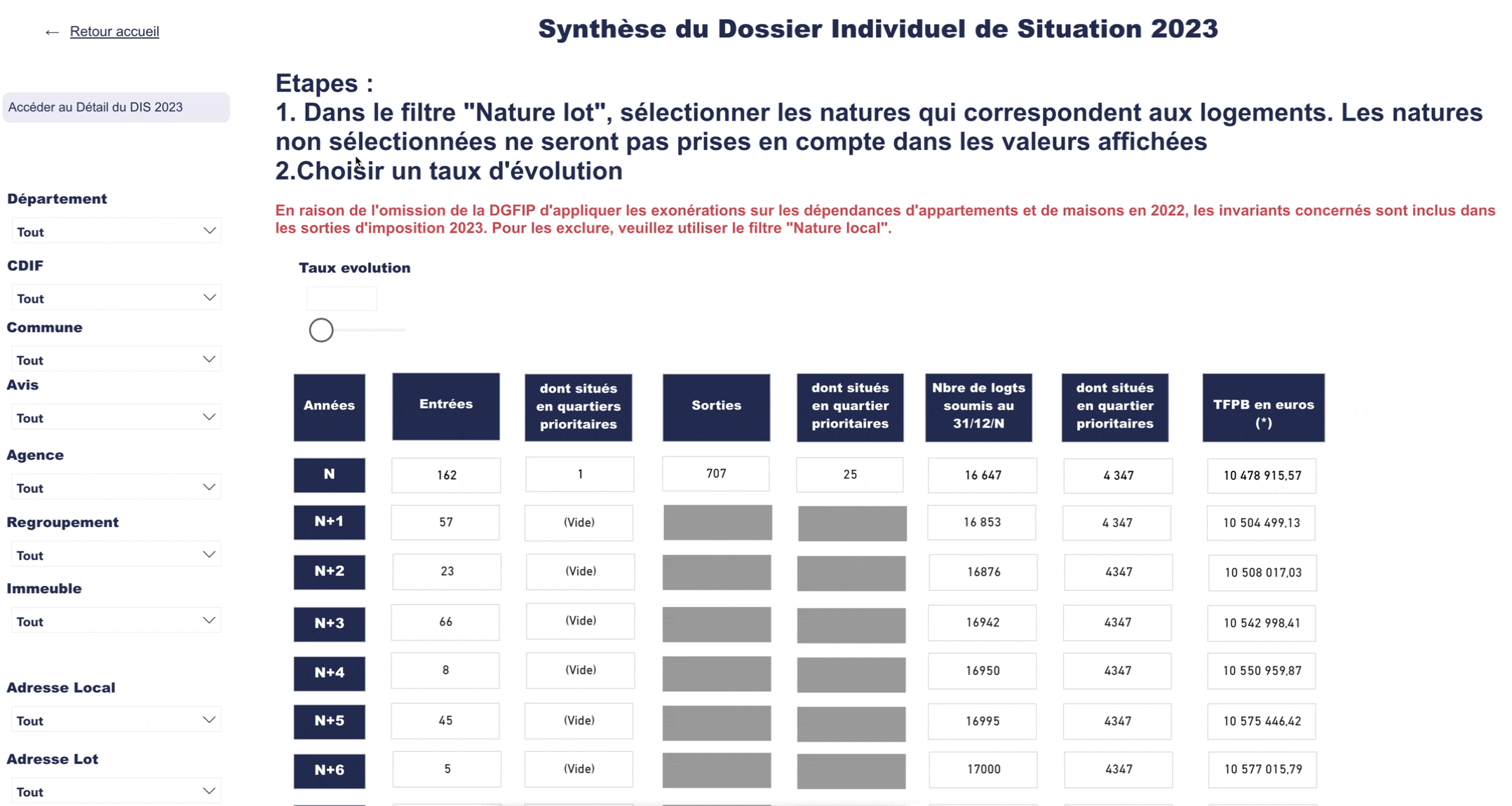 Les montants prévisionnel se base sur les valeurs locatives et taux en N. Vous pouvez simuler un taux d'évolution annuel en utilisant le champ "Taux évolution" situé au dessus du tableau synthétique