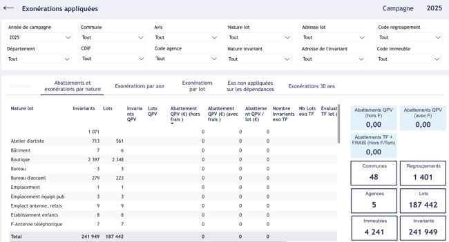 Pour consulter cette édition, rendez-vous dans le menu Pilotage > Reporting > Exonération et abattement