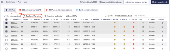 Sélectionnez les avis à dupliquer/ transférer en cliquant sur les cases à gauche du tableau.