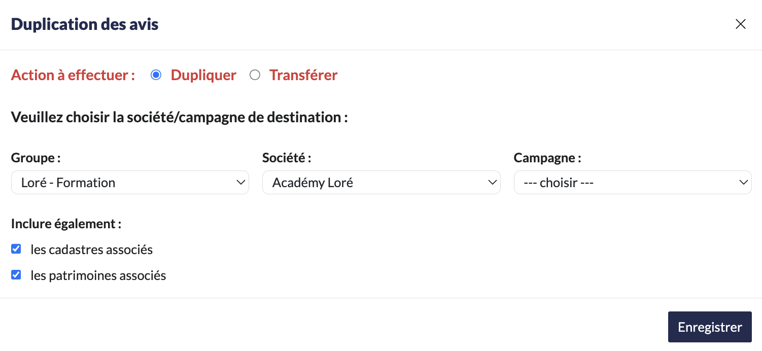 Il est possible de transférer/dupliquer un avis ainsi que les données patrimoniales associées d’une campagne à une autre, d’une société à l'autre.