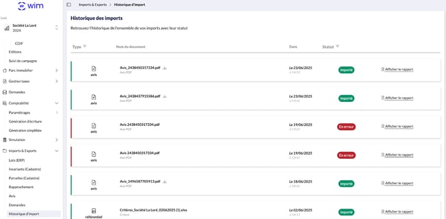 Après import de votre fichier ERP, consultez le récapitulatif de l’import dans Imports & Exports > Historique d’import.