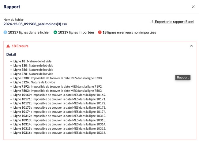 Vous pouvez cliquer sur Afficher les erreurs pour consulter la liste des anomalies et corriger les lignes concernées dans votre fichier ERP. Ce rapport d’erreur est également téléchargeable au format Excel.