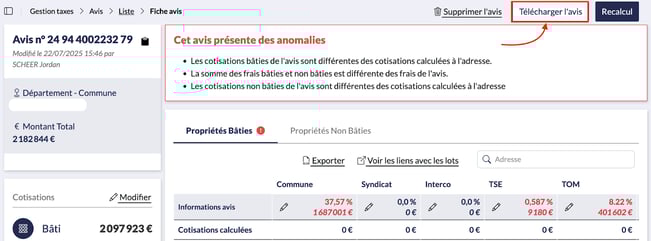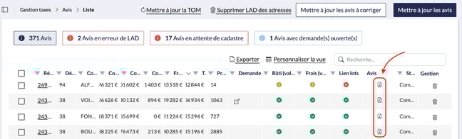 Depuis la fiche d’un avis dans Gestion taxes > Avis > Cliquez sur une référence d’avis, deux possibilités :