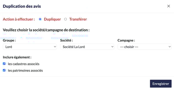 Dans la liste, cochez les cases correspondant aux avis que vous souhaitez transférer ou dupliquer.