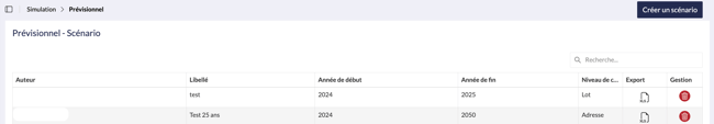 Une fois tous les éléments définis, cliquez sur Valider / Enregistrer en haut à droite. Le scénario sera alors disponible dans la liste et exportable en Excel.