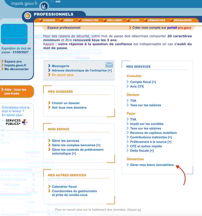 Votre adhésion au service GMBI sera validée lorsque le bouton "Gérer mes biens immobiliers" apparaîtra dans la rubrique "Démarches" de votre espace professionnel.