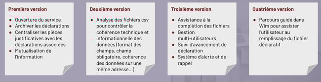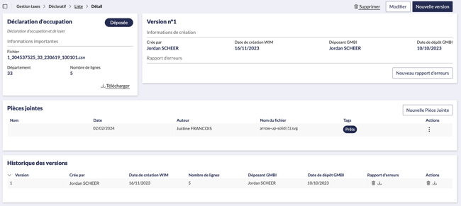 WIM vous permet de stocker et créer un historique de version. Pour une même version, vous n'êtes pas limités en termes de volume. Dans les fiches des déclarations, vous pourrez consulter le nombre de versions et télécharger les fichiers déposés.