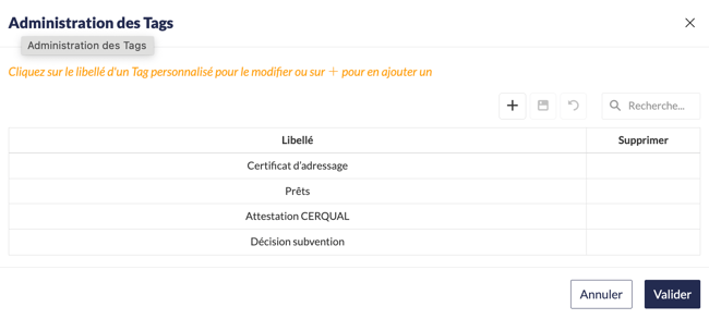 Les tags sont des mots-clés ou des libellés qui peuvent être attribués aux pièces jointes. Les tags sont utilisés pour organiser, catégoriser et faciliter la recherche de contenu spécifique.