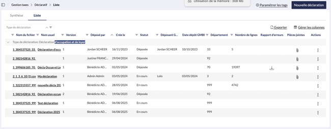 "Crée par" concerne l'utilisateur de WIM qui a stocké la déclaration. Déposant GMBI peut être différent et correspond à la personne de votre organisme qui a déposé la déclaration sur l'espace GMBI.