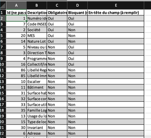 3. Remplissez la cellule E : "En-tête du champs (à remplir)"