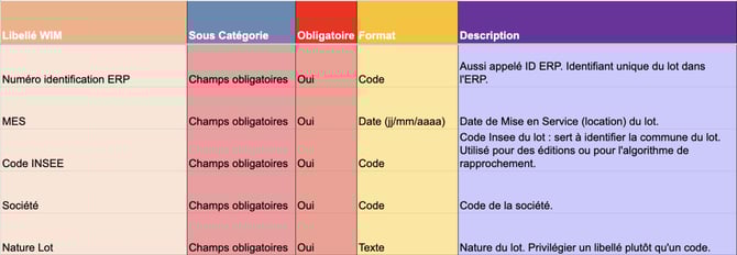 Ce tableau vous montre les champs obligatoires ainsi que les formats associés :