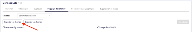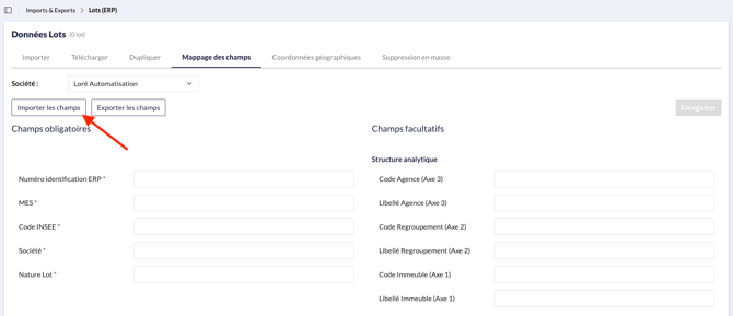 1. Suivez le chemin : "Imports & Exports" → "Lots (ERP)" → "Mappage des champs" → "Importer les champs".