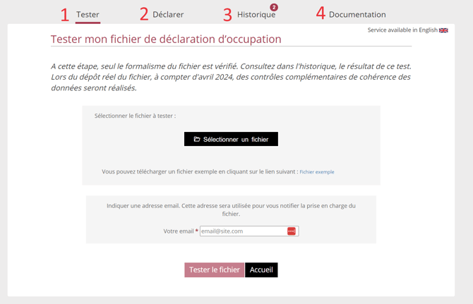 - Historique : Visualisation des statuts de dépôt et récupération des rapports d'erreur.