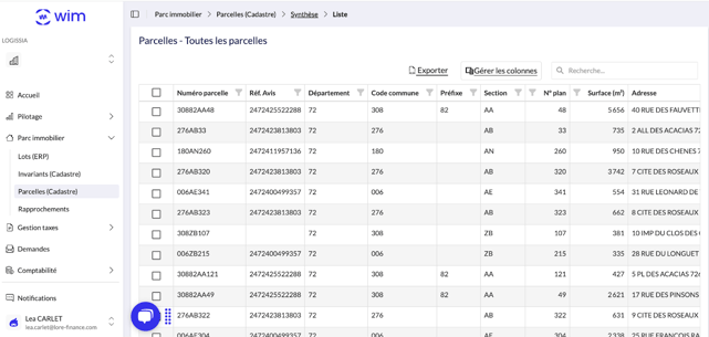 WIM permet une gestion complète et centralisée du patrimoine non bâti, en s'appuyant sur les parcelles cadastrales transmises par l’administration fiscale. L’outil propose à la fois une interface claire pour importer, visualiser et rapprocher les parcelles, et des fonctions avancées pour personnaliser l’affichage des données selon vos besoins métier.