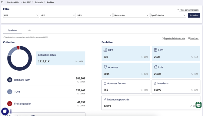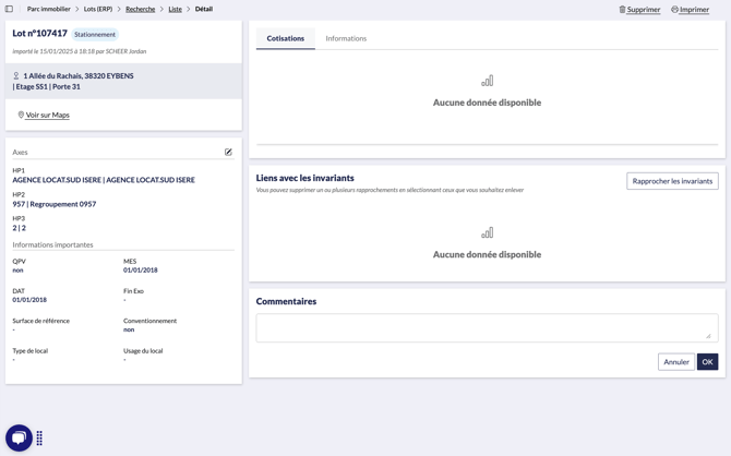 Dans cette vue, vous trouverez les cotisations affectées au lot, les caractéristiques du lot, le lien avec le ou les locaux.