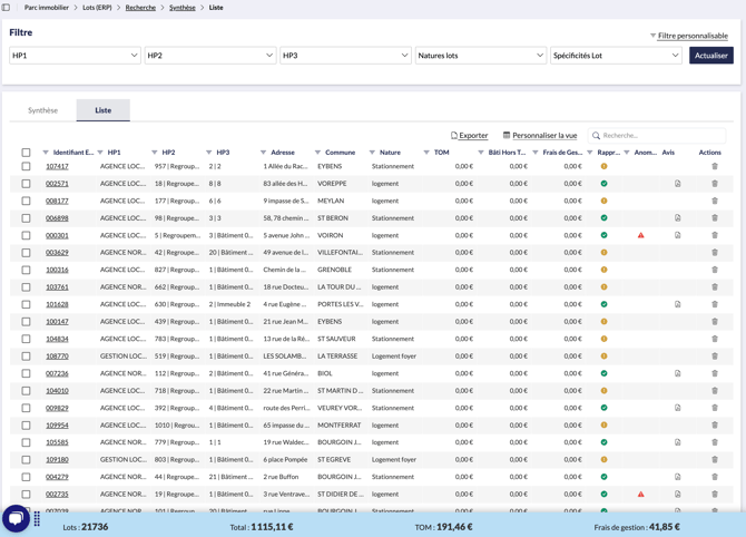 Chaque ligne représente un lot, et chaque colonne apporte des informations sur le lot en question : ID ERP, Axes Analytiques, Adresse, Communen TOM, Bati, Frais de Gestion, etc.