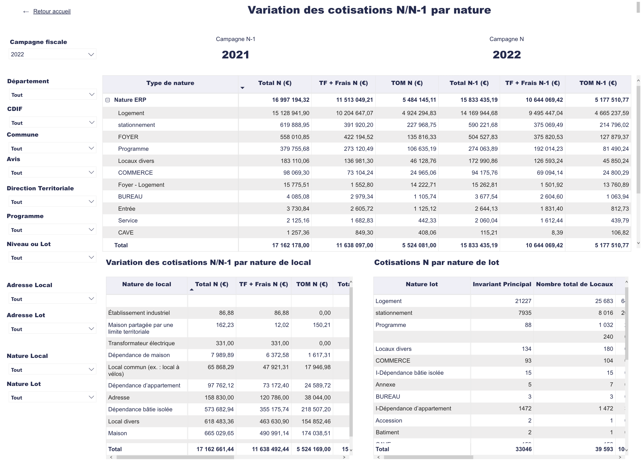 Le tableau Variation des cotisations N/N-1 par nature de local présente les mêmes cotisations que le premier tableau, mais par Nature de local du cadastre.