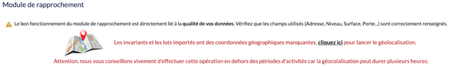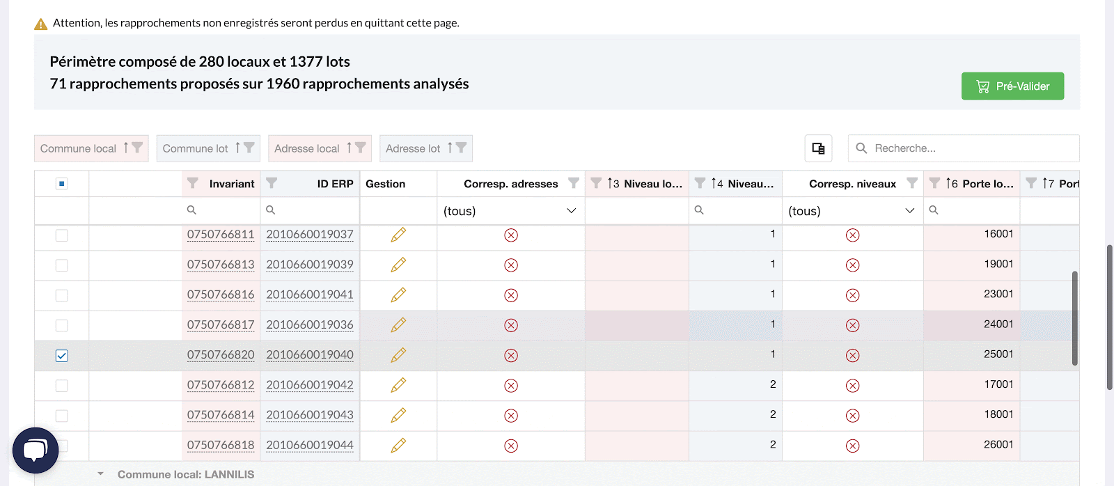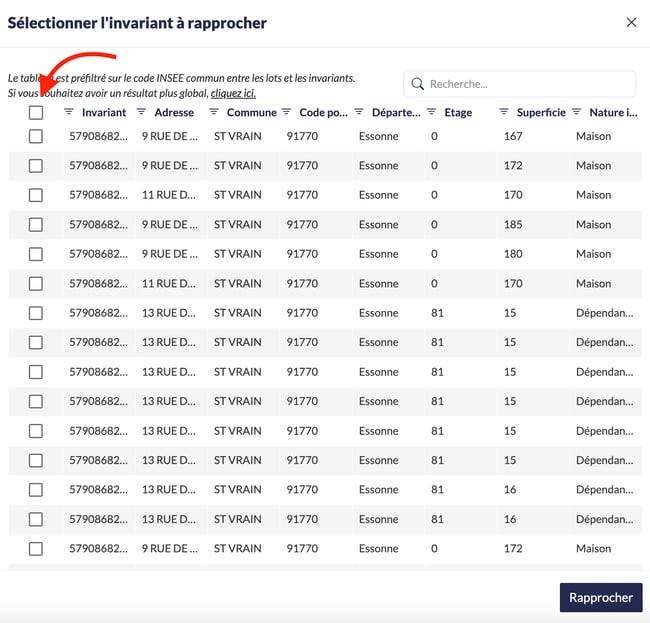 Pour cela, veillez à ce que des informations telles que l'adresse, le niveau, la surface et la porte soient intégrées avec précision pour faciliter la correspondance entre vos invariants et vos lots.