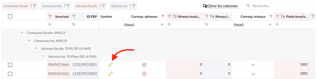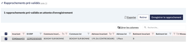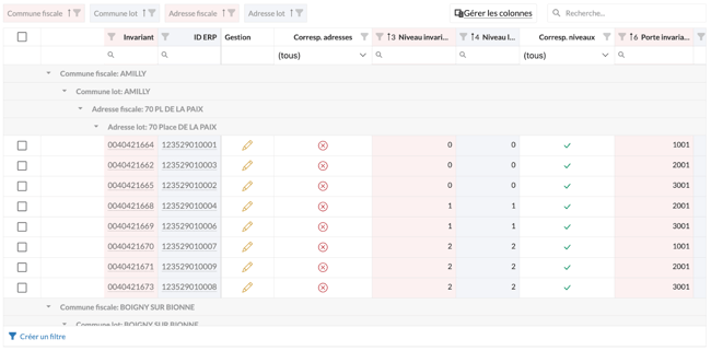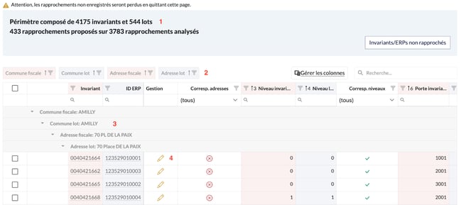 3 : Le tableau va organiser de manière automatique l'intégralité des suggestions de rapprochement en fonction des données géographiques, des lots et des invariants. En effet, le tri se fait de la manière suivante : Commune fiscale, Commune du lot, adresse fiscale et adresse du lot.