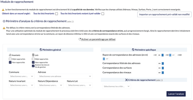 - Le module de rapprochement fonctionne par tests successifs : n'hésitez pas à expérimenter différents paramétrages afin d’identifier la configuration la plus pertinente pour vos données.