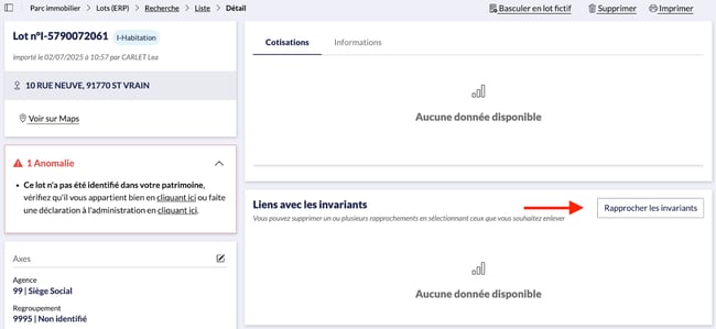 Dans le cas de rapprochements ponctuels, vous pouvez directement vous rendre sur une fiche de lot ou invariant depuis Parc immobilier > Lots (ERP) ou Invariants (Cadastre).