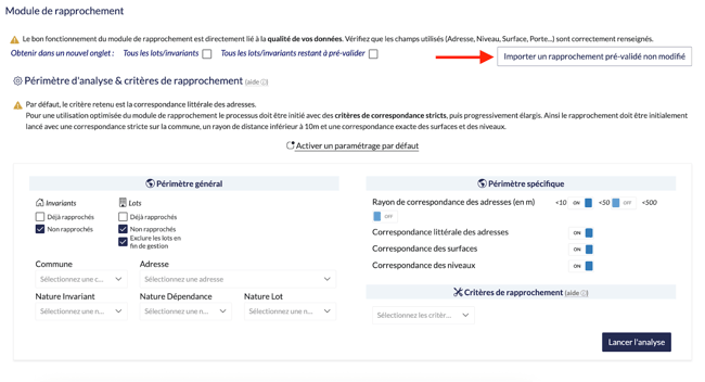 Ce fichier d'export peut ensuite être réimporté comme table de rapprochement dans WIM via le bouton Importer un rapprochement pré-validé non modifié.