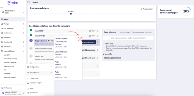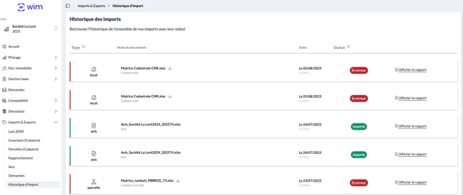 WIM permet de suivre l’état de vos imports de données (patrimoine, avis fiscaux, cadastre) et de gérer facilement les erreurs éventuelles.